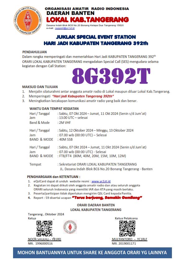 Dalam rangka memperingati dan memeriahkan Hari Jadi KABUPATEN TANGERANG 392TH ORARI LOKAL KABUPATEN TANGERANG mengadakan Special Call (SES) mengudara selama kegiatan dengan Call Station